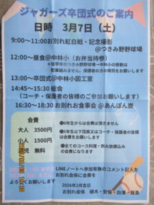 2026年3月7日(土)明け方までの雨もすっかり上がり、卒団式を祝うかのような青空。朝気温9度C、日中17度Cまで上がりすがすがしいいい天気おなりました。