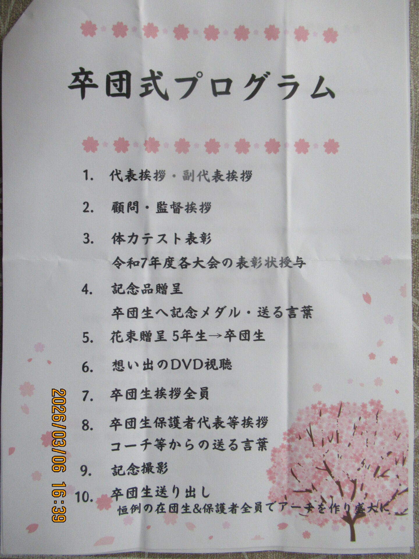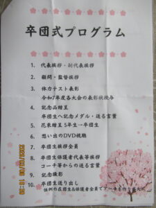 代表はじめ指導者の贈る言葉、記念メダル授与、花束贈呈、全員の記念サイン・送る言葉の色紙贈呈、卒団生の卒団ダンス披露、卒団生から記念品寄贈、卒団保護者力作の思い出のDVD上映、卒団生の挨拶・同保護者からの挨拶、お礼の言葉、記念撮影で二回目の人の輪トンネルで送り出しました。
